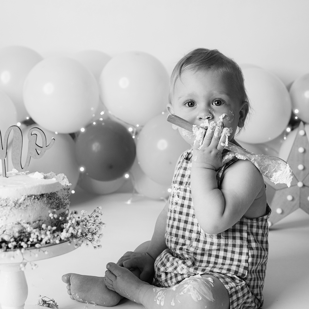 Primero hacemos retratos tranquilos en el decorado, para capturar su esencia y sus gestos naturales. Después llega la parte más divertida: la tarta o el cupcake. El peque juega, experimenta y se ensucia a su ritmo, sin nada forzado.